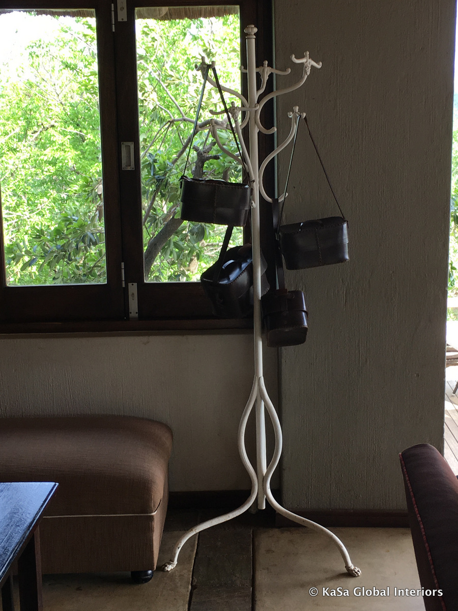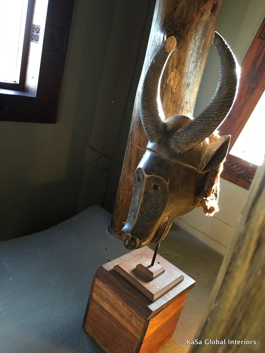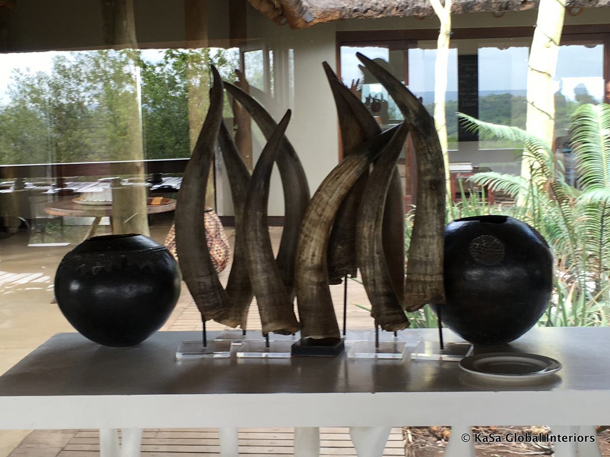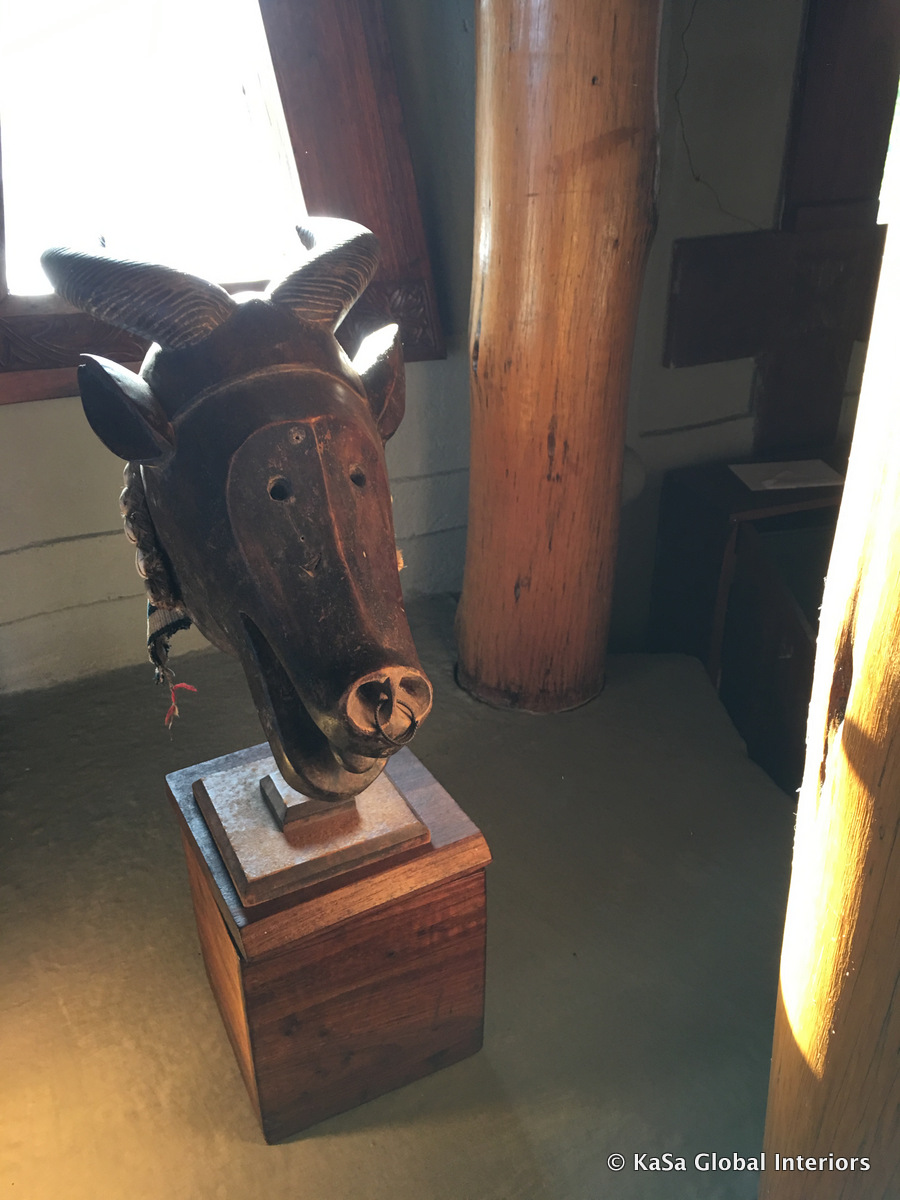Here, African masks may come to mind. But they are certainly not the only things that you may find on the wall of a safari lodge. From what we have seen, nearly everything that has some decorative appeal may be used as such – regardless of its originally intended use. Indeed, a few years ago we (not pictured) even found a set of bejeweled antelope skulls hanging off the wall above our beds. Somewhat… eccentric?
