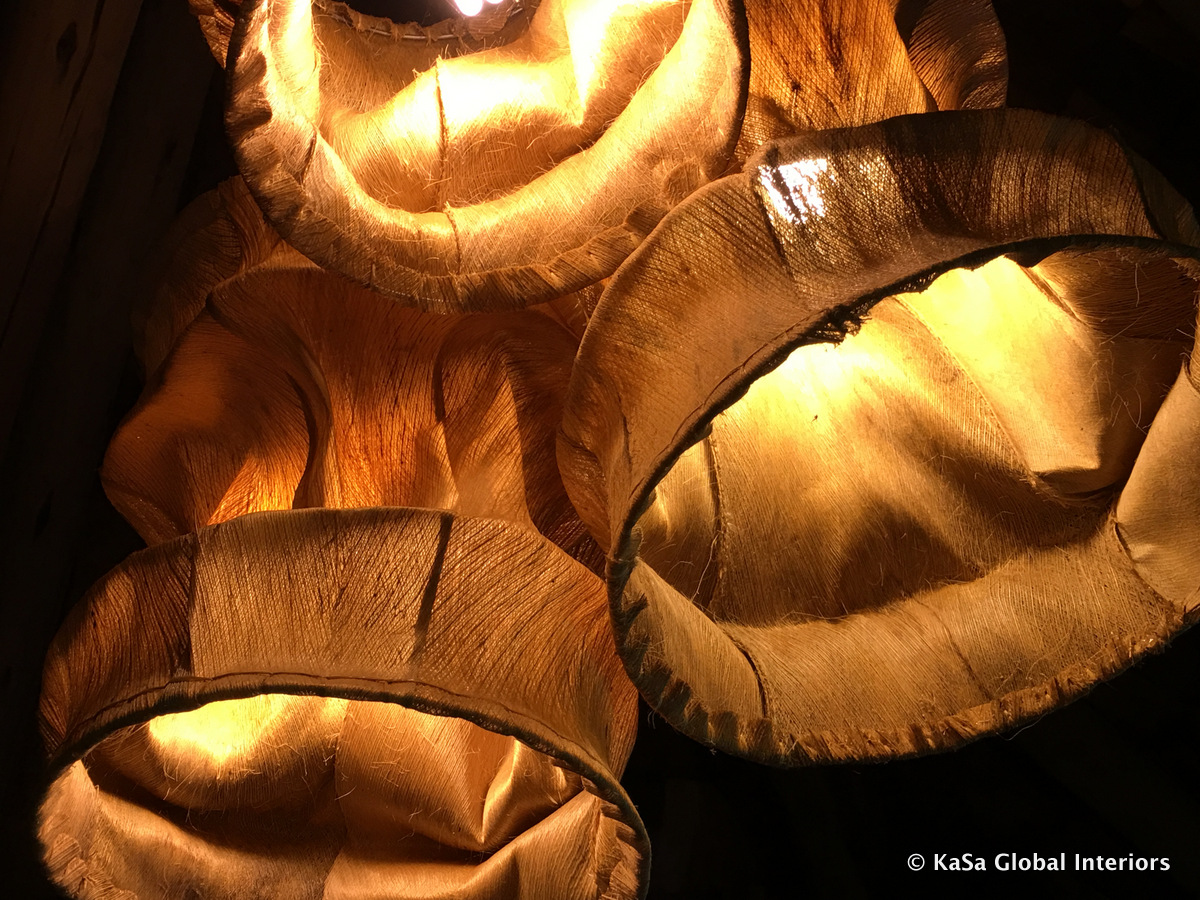 Light fixtures are wall mounted, hung from the ceiling, but also come in the form of hidden up/down lights, floor and table lamps. They are made from leather, woven fabric (made from grass or leaves),
