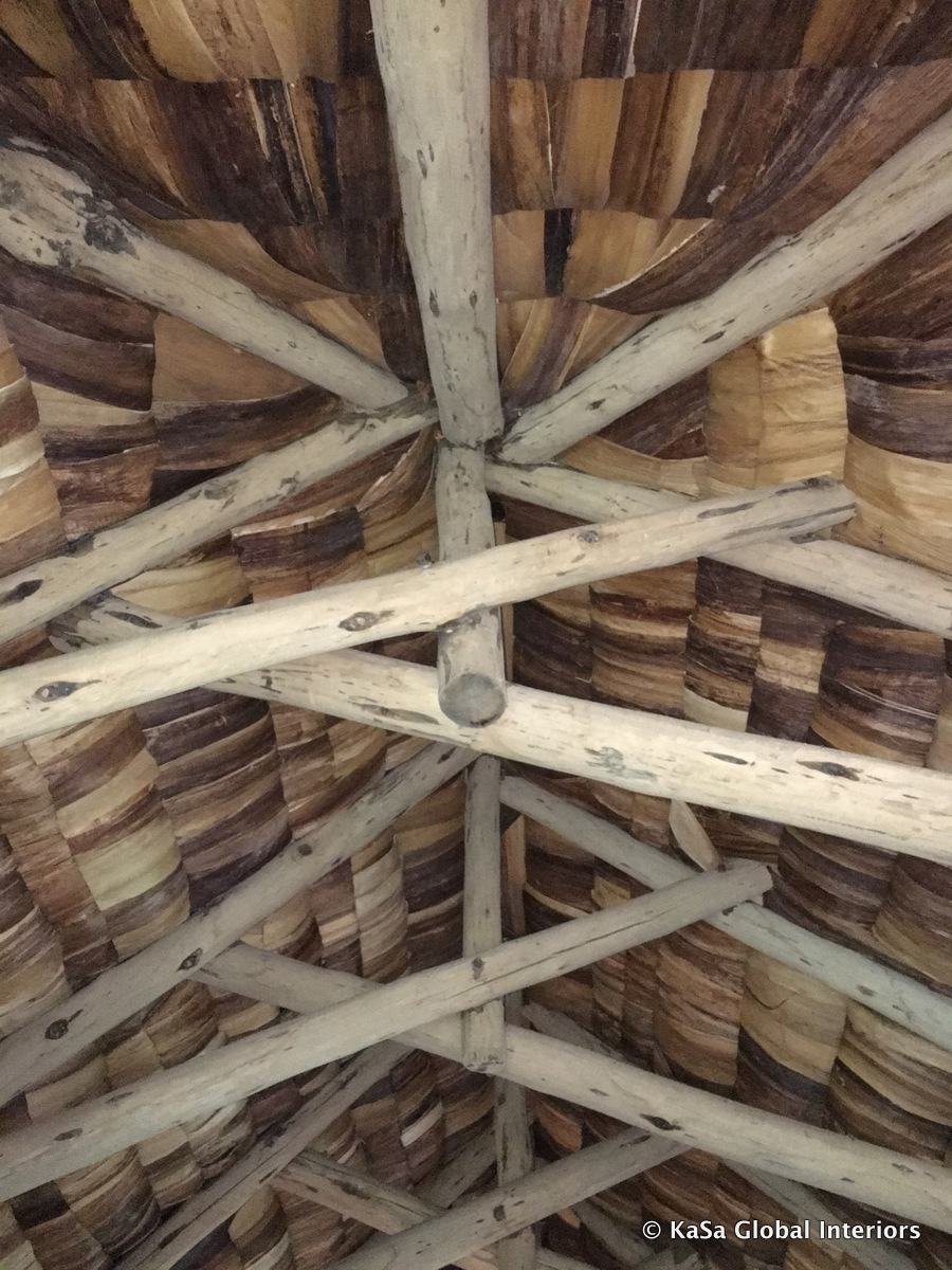 Exposed ceilings showing the beauty of the thatched roofs add a great deal of character to a room. Most ceiling patterns and the associated beam structures are so beautiful that they don’t require any additional decoration. The ones in the pictures below are made from banana leaves (Tree Lodge, Lake Manyara).