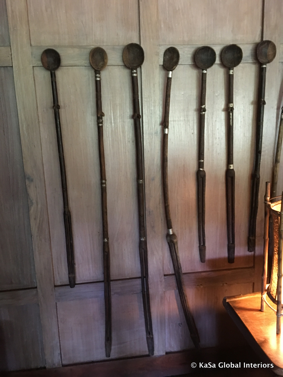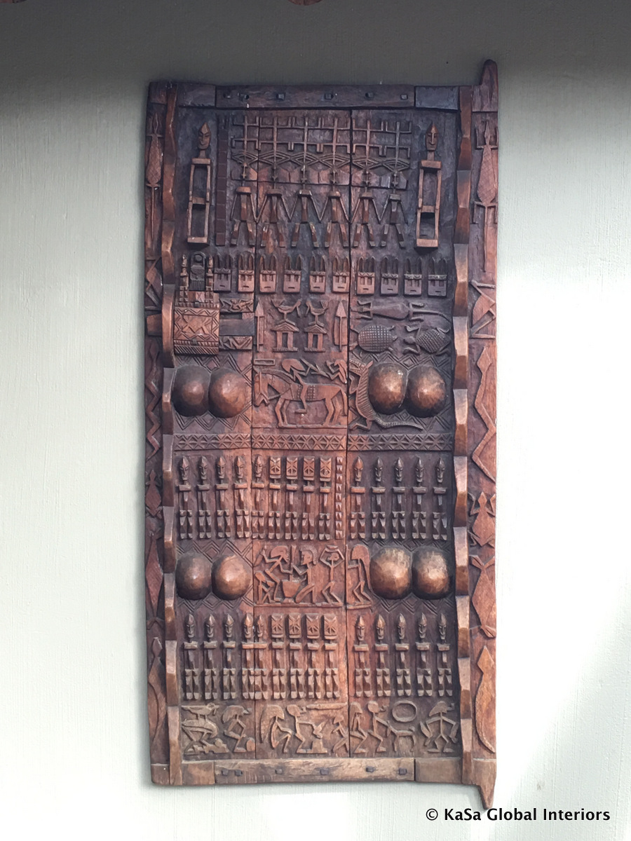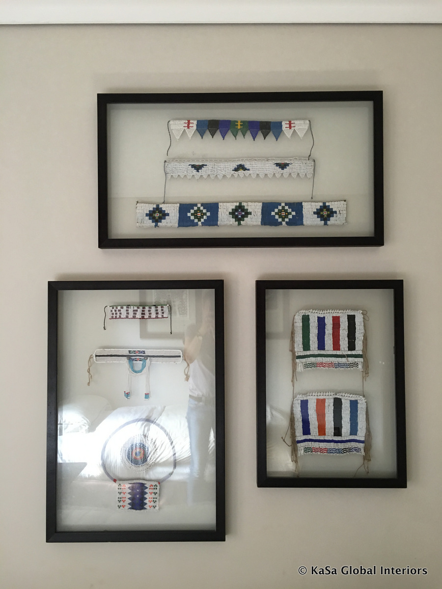Thus, you will find framed ethnic art (woven, beaded), impressive wood carvings, abstract art pictures, wooden bowls and trays, or even spoons hanging on the walls. All these artefacts are either directly pinned to the wall or framed. As is the case with much art, they may be displayed single, in groups of two or three or as a larger mixed display. The strictly neutral color scheme unites them and lets them blend into the room, while the apparent randomness of what’s put up adds playfulness to the space and a sense of collectedness.