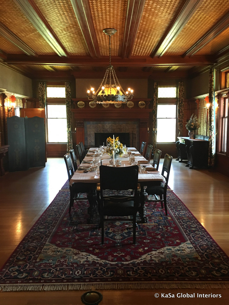 IMG_4396-001 Published August 23, 2016 at 900 × 1200 in Old Tahoe – Taking a Page from the Style Guide of Yesterday’s Super Rich ← Previous Next → Dining room: woven redwood pnels, oriental carpet, dark wood furniture (replicas)